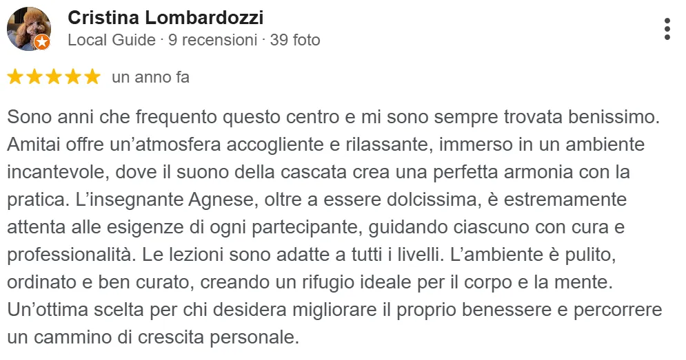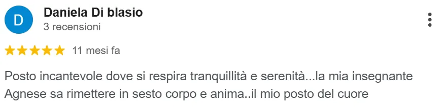 “Posto incantevole dove si respira tranquillità e serenità… la mia insegnante Agnese sa rimettere in sesto corpo e anima”