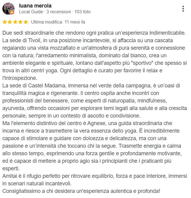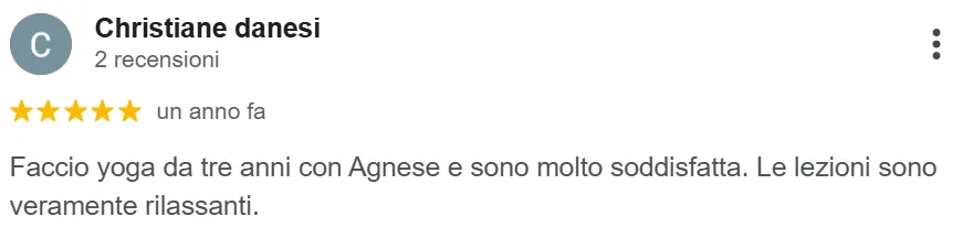 “Due sedi straordinarie… Ogni dettaglio è curato per favorire il relax e l’introspezione. Agnese è incredibilmente capace di stimolare e guidare con dolcezza e delicatezza chi la segue”
