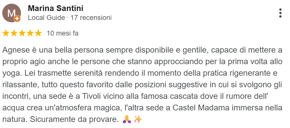 “Agnese è una bella persona… capace di mettere a proprio agio anche le persone che stanno approcciando per la prima volta allo Yoga”